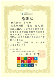 弊社もこの取り組みに賛同して本年も継続寄附を行い、長岡技術科学大学より感謝状を頂きました。